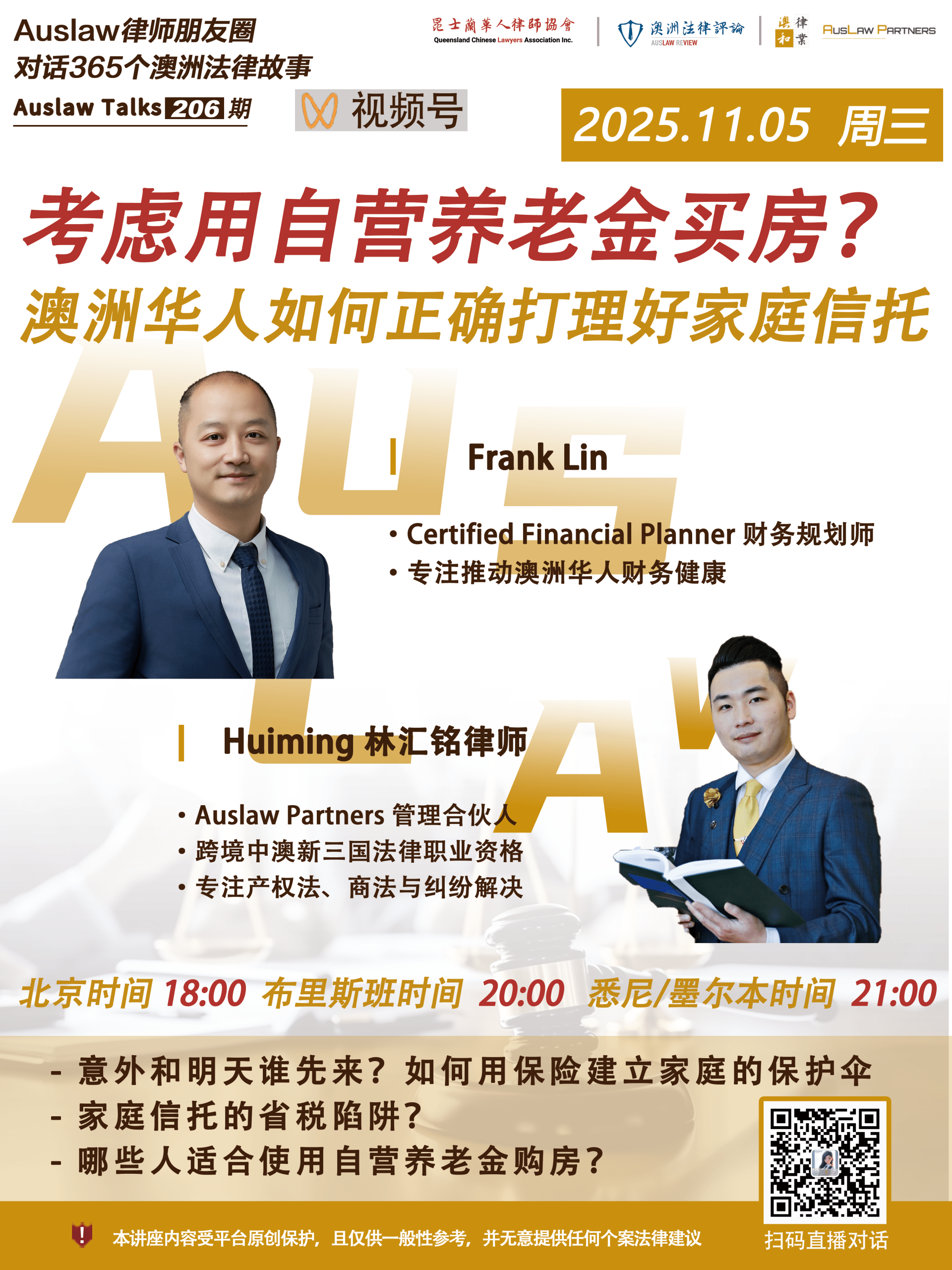 #澳法播客AuslawTalk 207期 #本期主题:如何挑选澳洲期房?日落条款新政解读 📅 日期: 2025年11月9日 周日 北京时间 10:00 + 布里斯班时间 12:00 + 悉尼/墨尔本时间 13:00 📝 播客嘉宾与话题: Huiming 林汇铭律师 × Mike Zhang Sutherland Projects销售主管 1️⃣律师和开发商双视角解读:签约前如何识别高风险项目 2️⃣期房合同中最容易忽略的关键条款 3️⃣探房黄金海岸CBD准现房项目 🔥扫码入群 = 预约直播 + 订阅澳洲法律咨询