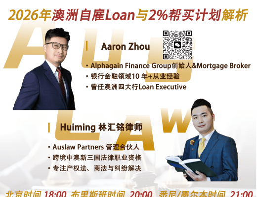 #澳法播客AuslawTalk 209期 #本期主题:来自他15年+从业的预判:2026年澳洲自雇贷款与2%帮买计划解析 📅 日期: 2025年12月10日 周三 北京时间 18:00 + 布里斯班时间 20:00 + 悉尼/墨尔本时间 21:00 📝 播客嘉宾与话题: Huiming 林汇铭律师 × Aaron Zhou Alphagain Finance Group创始人 1️⃣自雇贷款难点解读:银行卡你的三大因素 2️⃣利率下行+2% Help to Buyer如何影响澳洲楼市 3️⃣从四大行Banker到创业Broker:背后的机遇与挑战 🔥扫码入群 = 预约直播 + 订阅澳洲法律咨询